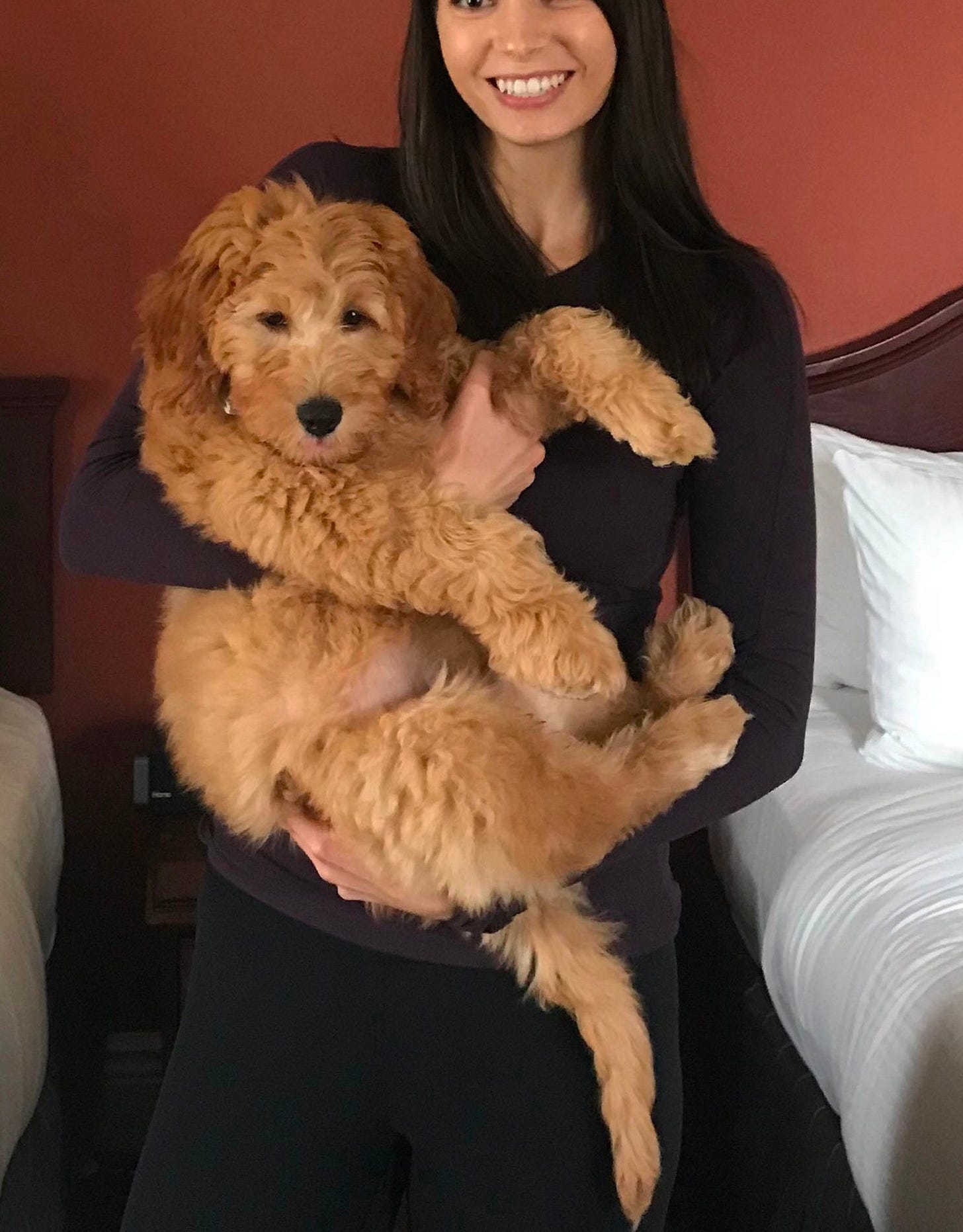 Insert a photo of a 20 something beautiful woman. Just show her teeth, but make sure there is a labradoodle in the pic.